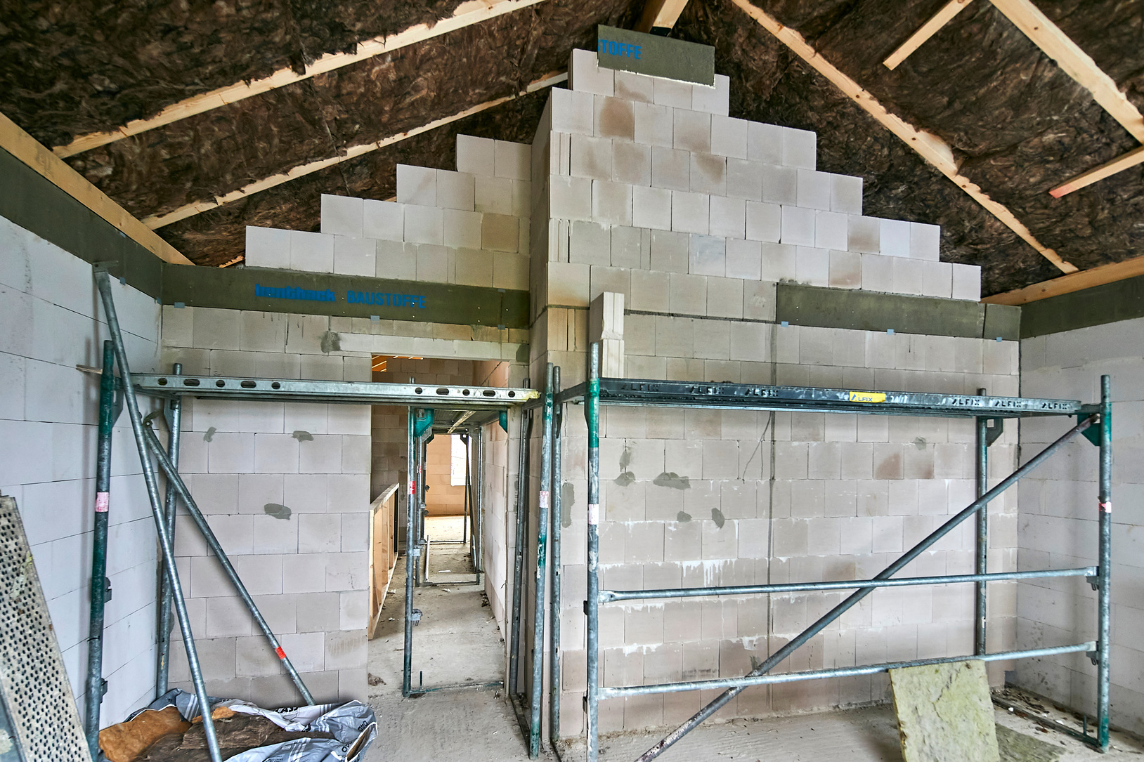 Hausbau mit Innenausbau der Fußbodenheizung und Sanitär