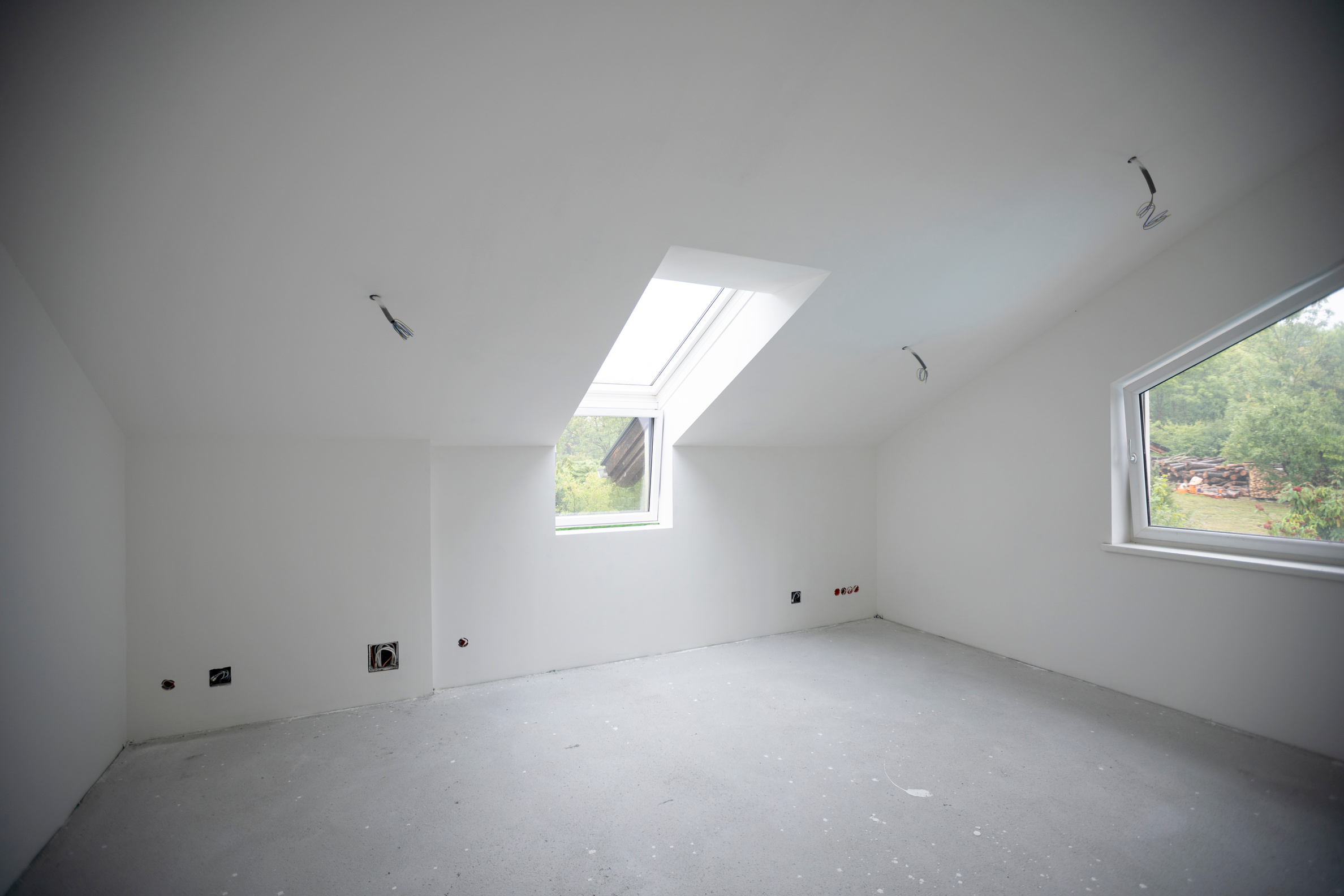 Attic finishing construction site in the phase drywall spackling and plastering before screeding